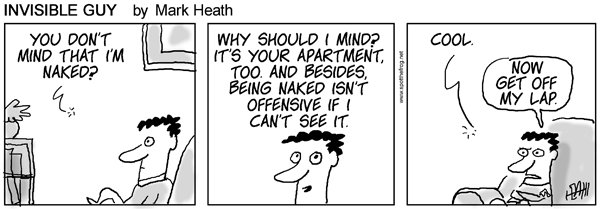 The Invisible Man is always naked, which makes him extremely visible in my imagination. Invisible Guy is my chance to show something you wouldn’t normally see in a mainstream comic strip, without actually showing it.